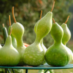 Gourds are a hot weather crop. They need full sun and deep, rich, well drained, organic soil with a pH of 5.5 to 6.5. Before planting, work in lots of compost. Directly plant seed outdoors in late May to June 2.5 cm deep in hills 2.4 m apart with 4-6 seeds per hill. After germination, thin to 3 plants per hill. Seed can be started indoors 3 weeks before the plant out date. They do not transplant well–use paper or fibre pots that can be set directly in the soil. Protect mature fruits from frost and cold temperatures.. How to prepare gourds for making birdhouses. Harvest gourds after the vine has withered but before frosts occur. Leave a portion of the stem attached. Before starting the curing process wash down the gourd with a sterilizing solution of 1 part bleach to 10 parts water. After that hang the gourds in a warm spot or lay them out on newspaper (turning them frequently). Curing can take anywhere from 3 to 6 months. Sometimes gourds develop surface mold as they dry – this is neither uncommon nor unexpected. If mold does show, wash the gourds with the same sterilizing solution as before. Throw out gourds that wrinkle or develop soft spots during the curing process. Once the gourd rattles when given a good shake it is ready. Germination occurs in 7-10 days.