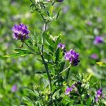 A deep-rooted, drought resistant perennial forage plant that also works well as a permanent cover crop in gardens and fields. As a deep rooted soil nutrient cycling, nitrogen fixing legume, it is a superb choice for use in soil enhancement/remediation programs. Most stands in cultivation as forage last at least three years. Yield losses are noticeable when stem counts are between 40 and 50 per square foot. If you are growing alfalfa as forage, consider replacing the stand when there are less than 40 stems per square foot. A good plant for pollinators. Reaches 45-60 cm in height. Sow at 22.5 kg/ha (20 lbs/acre). For smaller areas sow at 454 g per 180 sq. m. (1 lb/2000 sq. ft.).
