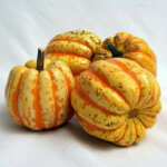 This beauty stands out in the garden with light yellow on orange sutures. Exceptional eating quality – fine grained light yellow flesh has a very sweet taste. Resistant to powdery mildew. Fruit averages 750 g and 10 cm x 12 cm in size. This winter squash doesn’t get the attention it should – which is a shame indeed!