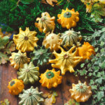 Unique claw-like projections form on small colourful gourds. This is a good selection for small gardens as the vines are quite compact. Fruit colour varies from cream, yellow, orange to green with stripes. The gourds average about 10 cm across. When the stems turn brown and dry, the gourds are ready for harvesting. If you are cramped for space, gourds easily lend themselves to growing vertically on a trellis or other supporting structure.