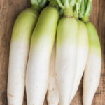 A very popular mild flavoured Japanese radish that resembles a large white carrot. Crisp, tender roots average 20 cm in length and 7 cm in diameter. The vitamin rich roots are superb when eaten raw, sliced in salads or peeled and diced for soups and stews.