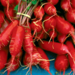 Bright red tapered roots ranging from 15-20 cm in length and approximately 5 cm across at the shoulder. Crunchy brilliant white flesh. A great choice for open sandy loam soil. Matures in 30-40 days.