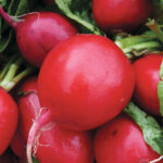 Large, rounded red radish growing to 3.75 cm across or more without becoming hollow or pithy. Crimson skin surrounds a crisp mild tasting white flesh. Very fast growing. A suitable plant for the kitchen container garden. Matures in 29 days.