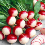 A beautiful round radish. The top half is a fine scarlet colour with a rosy edge bordering a pure white bottom half. Tender yet crisp flesh on what is possibly the finest market radish. Irrigation is essential for best flavour and root development. This variety tastes best when harvested around 2.5 cm in diameter. First grown here in the late 1930’s.