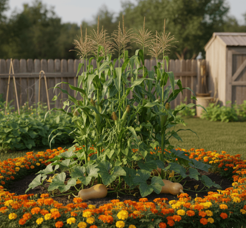 Symbiotic Benefits: The Corn provides a natural trellis for the Pole Beans. The Beans fix nitrogen in the soil, naturally fertilizing the heavy-feeding corn and squash. The large leaves of the Squash shade the ground, suppressing weeds and conserving moisture. The Marigold helps repel nematodes and certain insect pests. Full Sun and consistently moist, rich soil is essential.